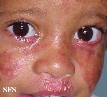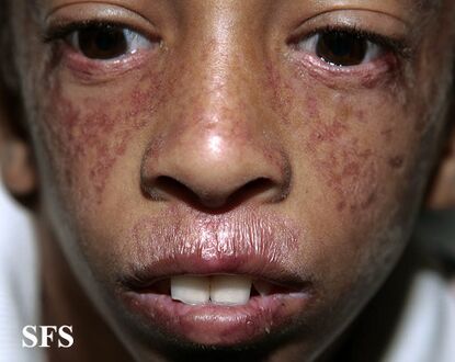 The second most commonly noted feature is a rash on the face that develops early in life as a result of sun exposure. The facial rash appears most prominently on the cheeks, nose, and around the lips. It is described as erythematous, that is red and inflamed, and telangiectatic, that is characterized by dilated blood vessels at the skin's surface. The rash commonly also affects the backs of the hands and neck, and it can develop on any other sun-exposed areas of the skin. The rash is variably expressed, being present in a majority but not all persons with Bloom syndrome, and it is on average less severe in females than in males. Moreover, the sun sensitivity can resolve in adulthood. There are other dermatologic changes, including hypo-pigmented and hyper-pigmented areas, cafe-au-lait spots, and telangiectasias, which can appear on the face and on the ocular surface.[citation needed]