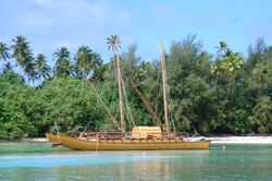 Polynesian navigation was used for thousands of years to enable long voyages across thousands of kilometres of the open Pacific Ocean. Polynesians made contact with nearly every island within the vast Polynesian Triangle, using outrigger canoes or double-hulled canoes. The double-hulled canoes were two large hulls, equal in length, and lashed side by side. The space between the paralleled canoes allowed for storage of food, hunting materials, and nets when embarking on long voyages.[1] Polynesian navigators used wayfinding techniques such as the navigation by the stars, and observations of birds, ocean swells, and wind patterns, and relied on a large body of knowledge from oral tradition.[2][3][4][5]