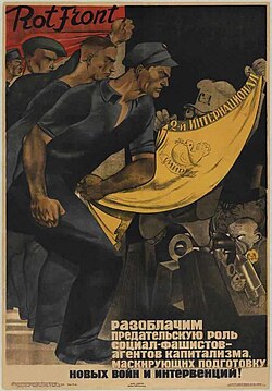 In the late 1920s and early 1930s, Stalin ordered Marxist-Leninist parties across the world to strongly oppose non-Marxist political parties, labour unions or other organizations on the left, which they labelled social fascists. In the usage of the Soviet Union, and of the Comintern and its affiliated parties in this period, the epithet fascist was used to describe capitalist society in general and virtually any anti-Soviet or anti-Stalinist activity or opinion.[69] Stalin reversed himself in 1934 with the Popular Front program that called on all Marxist parties to join with all anti-Fascist political, labour, and organizational forces that were opposed to fascism, especially of the Nazi variety.[70][71]