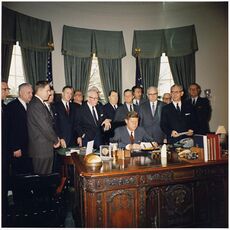 Three weeks later on Sunday, September 15, a bomb exploded at the 16th Street Baptist Church in Birmingham; by the end of the day, four Black children had died in the explosion, and two others were shot to death in the aftermath.[340] Due to this resurgent violence, the civil rights legislation underwent some drastic amendments that critically endangered any prospects for passage of the bill, to the outrage of Kennedy. He called the congressional leaders to the White House and by the following day the original bill, without the additions, had enough votes to get it out of the House committee.[341] Gaining Republican support, Senator Everett Dirksen promised the legislation would be brought to a vote preventing a Senate filibuster.[342] On July 2, 1964, the guarantees Kennedy proposed in his June 1963 speech became federal law, when President Johnson signed the Civil Rights Act.[342]