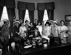 During the 1960 presidential campaign, Kennedy endorsed the concept of equal pay for equal work.[343] In December 1961, Kennedy signed an executive order creating the Presidential Commission on the Status of Women to advise him on issues concerning the status of women.[344] Former First Lady Eleanor Roosevelt led the commission. The commission's final report was issued in October 1963; it documented the legal and cultural discrimination women in America faced and made several policy recommendations to bring about change.[345] On June 10, 1963, Kennedy signed the Equal Pay Act of 1963, which amended the Fair Labor Standards Act and abolished wage disparity based on sex.[346]