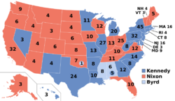 Kennedy's campaign gained momentum after the first debate, and he pulled slightly ahead of Nixon in most polls. On Election Day, Kennedy defeated Nixon in one of the closest presidential elections of the 20th century. In the national popular vote, by most accounts, Kennedy led Nixon by just two-tenths of one percent (49.7% to 49.5%), while in the Electoral College, he won 303 votes to Nixon's 219 (269 were needed to win).[153] Fourteen electors from Mississippi and Alabama refused to support Kennedy because of his support for the civil rights movement; they voted for Senator Harry F. Byrd of Virginia, as did an elector from Oklahoma.[153] Forty-three years old, Kennedy was the youngest person ever elected to the presidency (though Theodore Roosevelt was a year younger when he succeeded to the presidency after the assassination of William McKinley in 1901).[154]