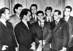 In April 1945, Kennedy's father, who was a friend of William Randolph Hearst, arranged a position for his son as a special correspondent for Hearst Newspapers; the assignment kept Kennedy's name in the public eye and "expose[d] him to journalism as a possible career."[70] That May he went to Berlin as a correspondent,[71] covering the Potsdam Conference and other events.[72]
