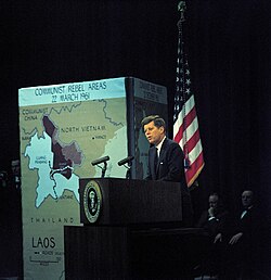 After the election, Eisenhower emphasized to Kennedy that the communist threat in Southeast Asia required priority; Eisenhower considered Laos to be "the cork in the bottle" in regards to the regional threat.[239] In March 1961, Kennedy voiced a change in policy from supporting a "free" Laos to a "neutral" Laos, indicating privately that Vietnam should be deemed America's tripwire for communism's spread in the area.[239] Though he was unwilling to commit U.S. forces to a major military intervention in Laos, Kennedy did approve CIA activities designed to defeat Communist insurgents through bombing raids and the recruitment of the Hmong people.[240]