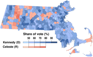 In 1958, Kennedy was re-elected to the Senate, defeating his Republican opponent, Boston lawyer Vincent J. Celeste, with 73.6 percent of the vote, the largest winning margin in the history of Massachusetts politics.[93] In the aftermath of his re-election, Kennedy began preparing to run for president by traveling throughout the U.S. with the aim of building his candidacy for 1960.[129][112]