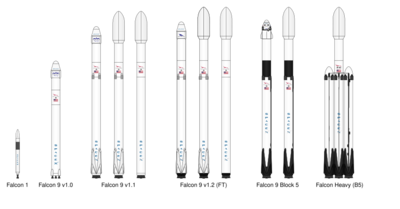 | Falcon 1 | Falcon 1e | Falcon 9 v1.0 | Falcon 9 v1.1 | Falcon 9 Full Thrust | Falcon Heavy | |
