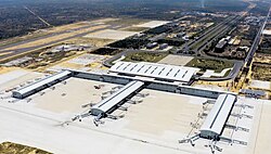 The main airport of Luanda was Quatro de Fevereiro Airport, which is still the largest in the country. A new international airport, Angola International Airport was constructed southeast of the city, a few kilometres from Viana, and was expected to be opened in 2011.[53] However, as the Angolan government did not continue to make the payments due to the Chinese enterprise in charge of the construction, the firm suspended its work in 2010. The airport finally opened in November 2023. The new airport will gradually replace the old airport.[54][55]