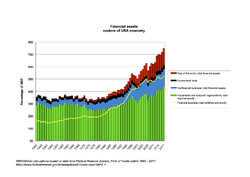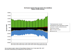 The Flow of Funds tables from the Federal Reserve System provide data about assets, which are tangible assets and financial assets, and liabilities. The difference, assets minus liabilities, is net worth.