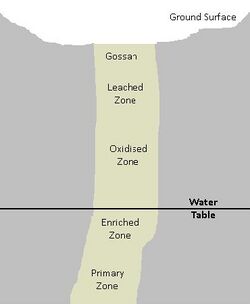Distinct zones of supergene processes can be identified at various depths. From the surface down they are the gossan cap, leached zone, oxidized zone, water table, enriched zone (supergene enriched zone) and primary zone (hypogene zone).[3]