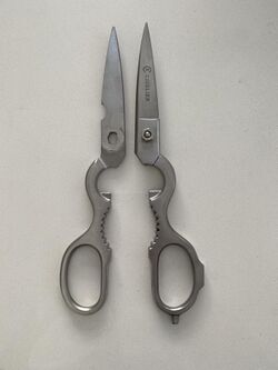 For food preparation and other purposes. Usually made from stainless steel for hygiene and rust-resistance. May have additional kitchen functionality in the handles, such as bottle-cap remover, fish scaler, nutcracker. |