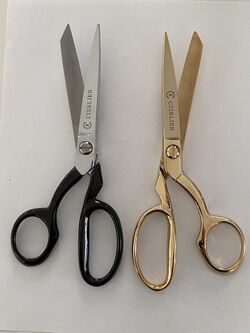 Dressmaker's shears have a long blade, typically 7–10 in (18–25 cm), for cutting out fabric. Blades are tapered, with one pointed and one rounded tip; the blunt tip prevents fabric from snagging on seams and threads. Blades have a "knife edge": the top blade is set at an acute angle which allows the scissors to cut through fabric easily. Heavier-duty than general scissors, the bottom blade sits flush on the table, making it easier to cut accurately through fabric. This photo is of a left-handed pair of shears. |