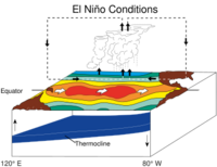 ENSO describes a quasi-periodic change of both oceanic and atmospheric conditions over the tropical Pacific Ocean.[22] These changes affect weather patterns across much of the Earth.[23] The tropical Pacific is said to be in one of three states of ENSO (also called "phases") depending on the atmospheric and oceanic conditions.[28] When the tropical Pacific roughly reflects the average conditions, the state of ENSO is said to be in the neutral phase. However, the tropical Pacific experiences occasional shifts away from these average conditions. If trade winds are weaker than average, the effect of upwelling in the East Pacific and the flow of warmer ocean surface waters towards the West Pacific lessen. This results in a cooler West Pacific and a warmer East Pacific, leading to a shift of cloudiness and rainfall towards the East Pacific. This situation is called El Niño. The opposite occurs if trade winds are weaker than average, leading to a warmer West Pacific and an cooler East Pacific. This situation is called La Niña and is associated with increased cloudiness and rainfall over the West Pacific.[22]