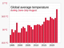 It is thought that there have been at least 30 El Niño events since 1900, with the 1982–83, 1997–98 and 2014–16 events among the strongest on record.[51] Since 2000, El Niño events have been observed in 2002–03, 2004–05, 2006–07, 2009–10, 2014–16, 2018–19,[52][53][54] and 2023–24.[55][56]
