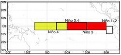 Although the Southern Oscillation Index has a long station record going back to the 1800s, its reliability is limited due to the latitudes of both Darwin and Tahiti being well south of the Equator, so that the surface air pressure at both locations is less directly related to ENSO.[36] To overcome this effect, a new index was created, named the Equatorial Southern Oscillation Index (EQSOI).[36][37] To generate this index, two new regions, centered on the Equator, were defined. The western region is located over Indonesia and the eastern one over the equatorial Pacific, close to the South American coast.[36] However, data on EQSOI goes back only to 1949.[36]