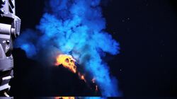 At shallow depths it is common for submarine eruptions to be explosive due to the reaction between volatiles in the magma and water which generates a significant quantity of steam.[7] These eruptions described as Surtseyan are characterised by large quantities of steam and gas and creating large amounts of pumice.[8] This activity has occurred in many locations. An example is Fukuto-Okanoba near Japan . This activity has been observed for almost a century and causes discoloured water, jets of steam and ash, and pumice is found floating in the surrounding water.[9]