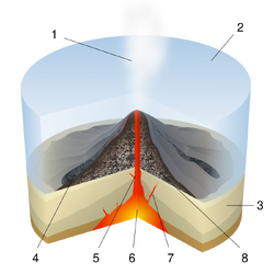 There is much variation in the style of submarine eruptions.[3] This changes with a number of variables including magma viscosity, water depth, effusion rate and volatile content.[2] Many studies highlight the effects of pressure which increases with depth. It is believed that increased pressure restricts the release of volatile gases, resulting in effusive eruptions.[6] This is not to say that explosive eruptions do not occur at depth, just that a higher volatile content is required. It has been estimated that at 500 m explosive activity associated with basalts is suppressed, while depths greater than 2300 m would be sufficient to prevent the majority of explosive activity from rhyolite lava.[1]