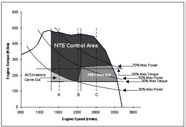 From Handwiki The Not-To-Exceed (NTE) standard promulgated [when?] by the United States Environmental Protection Agency (EPA) ensures that heavy-duty truck engine emissions are controlled over the full range of speed and load combinations commonly experienced in use. NTE establishes an area (the "NTE zone") under the torque curve of an engine where emissions must not exceed a specified value for any of the regulated pollutants. The NTE test procedure does not involve a specific driving cycle of any specific length (mileage or time). Rather it involves driving of any type that could occur within the bounds of the NTE control area, including operation under steady-state or transient conditions and under varying ambient conditions. Emissions are averaged over a minimum time of thirty seconds and then compared to the applicable NTE emission limits.[1]