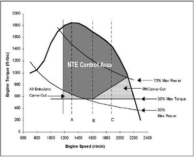 The NTE test, as defined in CFR 86.1370-2007, establishes an area (NTE control area) under the torque curve of an engine where emissions must not exceed a specified emission cap for a given pollutant. The NTE cap is set at 1.25 times the FTP emission limit as described in the subsection above. For 2005 model year heavy-duty engines, the NTE emission cap for NMHC plus NOx is 1.25 times 2.5 grams per brake horsepower-hour, or 3.125 grams per brake horsepower-hour. The basic NTE control area for diesel engines has three basic boundaries on the engine's torque and speed map. The first is the upper boundary that is represented by an engine's maximum torque at a given speed. The second boundary is 30 percent of maximum torque. Only operation above this boundary is included in the NTE control area. The third boundary is determined based on the lowest engine speed at 50 percent of maximum power and highest engine speed at 70 percent of maximum power. This engine speed is considered the "15 percent operational engine speed". The fourth boundary is 30% of maximum power [4]