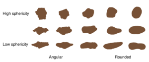 The shape of particles can be defined in terms of three parameters. The form is the overall shape of the particle, with common descriptions being spherical, platy, or rodlike. The roundness is a measure of how sharp grain corners are. This varies from well-rounded grains with smooth corners and edges to poorly rounded grains with sharp corners and edges. Finally, surface texture describes small-scale features such as scratches, pits, or ridges on the surface of the grain.[1]