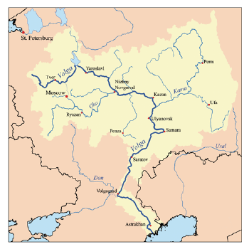 In 1839 Robert Bremner referred to the Volga as an essential part of Russia, a cornerstone of the life of Russian people. He said, "Without this river the Russians could not live."[23] At the time of Bremner’s survey, half of the Russian empire’s fish was caught in the single stretch of river by Astrakhan, a city in the upper part of the Volga Delta, 60 miles (100 km) from the Caspian Sea.[24]