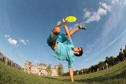 Freestyle catches are generally split into two overlapping categories: blind and restricted.[22] Blind catches are ones where the player cannot see the disc entering the hand and include popular moves such as scarecrow and phlaud.[23][24] Restricted catches involve positioning the hand around some part of the body, such as under the leg or behind the back. One of the most famous and iconic freestyle catches is called "gitis" and involves catching a disc with one hand over and around the opposite leg.[25] Catches can also be performed between the legs or by resting on parts of the body such as the back.