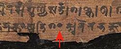 While the numerals in texts and inscriptions used a named place-value notation, a more efficient notation might have been employed in calculations, possibly from the 1st century CE. Computations were carried out on clay tablets covered with a thin layer of sand, giving rise to the term dhuli-karana ('sand-work') for higher computation. Karl Menninger believes that, in such computations, they must have dispensed with the enciphered numerals and written down just sequences of digits to represent the numbers. A zero would have been represented as a "missing place", such as a dot.[15] The single manuscript with worked examples available to us, the Bakhshali manuscript (of unclear date), uses a place value system with a dot to denote the zero. The dot was called the shunya-sthāna 'empty-place'. The same symbol was also used in algebraic expressions for the unknown (as in the canonical x in modern algebra).[16]