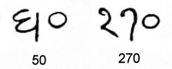 By the end of the 7th century, decimal numbers begin to appear in inscriptions in Southeast Asia as well as in India.[22] Some scholars hold that they appeared even earlier. A 6th century copper-plate grant at Mankani bearing the numeral 346 (corresponding to 594 CE) is often cited.[26] But its reliability is subject to dispute.[22][27] The first indisputable occurrence of 0 in an inscription occurs at Gwalior in 876 CE, containing a numeral "270" in a notation surprisingly similar to ours.[28] Throughout the 8th and 9th centuries, both the old Brahmi numerals and the new decimal numerals were used, sometimes appearing in the same inscriptions. In some documents, a transition is seen to occur around 866 CE.[22]