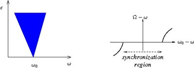 where \(\Delta\phi=\phi-\omega t\) is the difference between the phases of the oscillations and of the forcing. Function \(q\) is \(2\pi\)-periodic, and in the simplest case \(q(\cdot)=\sin(\cdot)\) Eq. (3) is called the Adler equation. One can easily see that on the plane of parameters of the external forcing "frequency mismatch \((\omega-\omega_0)\) -- amplitude \(\varepsilon\)" there is a region \(\varepsilon q_{min}<\omega-\omega_0<\varepsilon q_{max}\) where Eq. (3) has a stable stationary solution that exactly corresponds to phase locking (the phase \(\phi\) just follows the phase of the forcing, i.e. \(\phi=\omega t +\mbox{constant}\)) and frequency entrainment (the observed frequency of the oscillator \(\Omega=\langle \dot{\phi}\rangle \) exactly coincides with the forcing frequency \(\omega\)). This region is called synchronization region, or Arnold tongue.