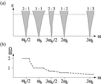 If the frequencies of the oscillator and of the force fulfill \(n\omega\approx m\omega_0\ ,\) then the dynamics of the generalized phase difference \(\Delta\phi=m\phi-n\omega t\) is described by the equation similar to Eq.~(3), namely by \({d(\Delta\phi)/dt}=-(n\omega-m\omega_0) +\varepsilon \tilde q(\Delta\phi)\ .\) Synchronous regime then means perfect entrainment of the oscillator frequency at the rational multiple of the forcing frequency, \(\Omega={n\over m}\omega\ ,\) as well as phase locking \(m\phi=n\omega t +\mbox{constant}\ .\) The overall picture for a broad range of forcing frequencies is presented by a family of triangular-shaped synchronization regions touching the \(\omega\)-axis at the rationals of the natural frequency \({m\over n}\omega_0\) ( Figure 3(a)).