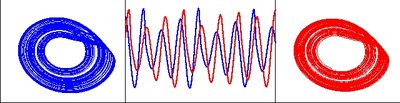 Quite often one can find a projection of the strange attractor that looks like a smeared limit cycle; phase is then introduced as a variable that gains \(2\pi\) with each rotation. These rotations are nonuniform due to chaos, what can be modelled by an effective noise in phase dynamics. If this noise is small (i.e. the rotations are rather uniform), the mean frequency of the system can be entrained by a periodic forcing while the chaos is preserved. If two or more chaotic oscillators with different natural frequencies interact, their mean frequencies can be adjusted while the amplitudes remain chaotic and only weakly correlated, see Pikovsky et al. (2001) for details.