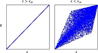 Another type of chaotic synchronization --- complete synchronization --- can be observed for identical chaotic systems of any type (maps, autonomous or driven time-continuous systems). In the simplest case of two diffusively coupled in all variables systems the dynamics is described by \(\tag{5} {d\vec{x}\over dt}=\vec{F}(\vec{x})+\varepsilon (\vec{y}-\vec{x}) \,,\qquad {d\vec{y}\over dt}=\vec{F}(\vec{y})+\varepsilon (\vec{x}-\vec{y}) \,, \)