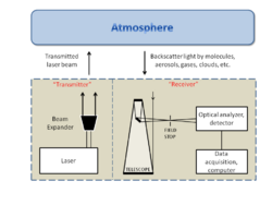 A simplified representation of a lidar set-up is demonstrated in Figure 1. The transmission unit consists of a laser source, followed by a series of mirrors, and a beam expander which sends the collimated light beam vertically up to the open atmosphere. Part of the transmitted radiation is scattered by atmospheric components (i.e., gases, molecules, aerosols, clouds) backward to the lidar, where it is collected by a telescope. The backscattered light is driven to an optical analyzer where the optical signal is first spectrally separated, amplified and transformed to an electrical signal. Finally, the signal is digitized and stored in a computer unit.
