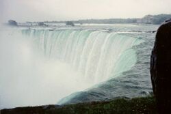 About 10,900 years ago, the Niagara Falls was between present-day Queenston, Ontario, and Lewiston, New York, but erosion of their crest has caused the waterfalls to retreat approximately 6.8 miles (10.9 km) southward.[18] The Horseshoe Falls, which are about 2,600 feet (790 m) wide, have also changed their shape through the process of erosion; evolving from a small arch to a horseshoe bend, to the present day gigantic V.[19] Just upstream from the falls' current location, Goat Island splits the course of the Niagara River, resulting in the separation of the mostly Canadian Horseshoe Falls to the west from the American and Bridal Veil Falls to the east.[14] Engineering has slowed erosion and recession.[20]