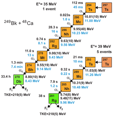 The experiment began in late July 2009.[27] In January 2010, scientists at the Flerov Laboratory of Nuclear Reactions announced internally that they had detected the decay of a new element with atomic number 117 via two decay chains: one of an odd–odd isotope undergoing 6 alpha decays before spontaneous fission, and one of an odd–even isotope undergoing 3 alpha decays before fission.[30] The obtained data from the experiment was sent to the LLNL for further analysis.[31] On 9 April 2010, an official report was released in the journal Physical Review Letters identifying the isotopes as 294117 and 293117, which were shown to have half-lives on the order of tens or hundreds of milliseconds. The work was signed by all parties involved in the experiment to some extent: JINR, ORNL, LLNL, RIAR, Vanderbilt, the University of Tennessee (Knoxville, Tennessee , U.S.), and the University of Nevada (Las Vegas, Nevada, U.S.), which provided data analysis support.[32] The isotopes were formed as follows:[33][lower-alpha 4]