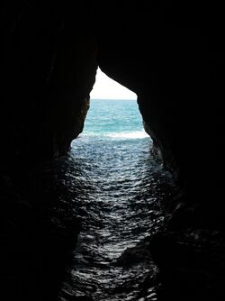The Rosh HaNikra grottoes are cavernous tunnels formed by sea action on the soft chalk rock. The total length of the tunnels is some 200 meters. They branch off in various directions with some interconnecting segments. A tunnel was built by the British for the Haifa-Beirut railroad line, and in 1968 a second one was dug, both connecting the grottoes with each other and allowing access (currently: only exit) along the former route of the British railroad. For many years though, the only access to the grottoes was from the sea and the native swimmers and divers were the only ones capable of visiting. The 400 meters long tunnel dug in 1968 between the grottoes and slightly above sea level allowed easier access, and soon after a cable car was built to take visitors down from the top of the cliff to the tunnels.[1][2] With a 60-degree gradient, this cable car is advertised as the steepest in the world.