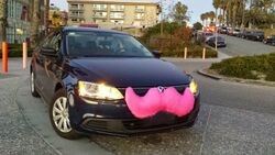 Lyft's marketing strategy included large pink furry mustaches that drivers attached to the front of their cars and encouraging riders to sit in the front seat and fist bump with drivers upon meeting.[7] In November 2014, the company distanced itself from the fist bump.[8][9] In January 2015, Lyft introduced a small, glowing plastic dashboard mustache it called a "glowstache" as an alternative to the large fuzzy mustaches on the front of cars. The transition was to help overcome the resistance of some riders to arrive at destinations, such as business meetings, in a car with a giant mustache.[10]