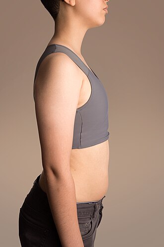 Tucking is the act of inserting one's testicles inside one's body, placing one's penis between one's legs, and securing it all with a gaff (a form of underwear). It can prevent unsightly bulges in clothing, especially swimwear and bodysuits. The FTM equivalent is binding the breasts with a binder, a Spandex undergarment that flattens the chest.