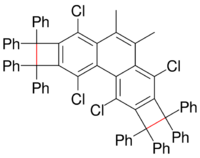 Another notable compound with an extraordinary C-C bond length is tricyclobutabenzene, in which a bond length of 160 pm is reported. Longest C-C bond within the cyclobutabenzene category is 174 pm based on X-ray crystallography.[3] In this type of compound the cyclobutane ring would force 90° angles on the carbon atoms connected to the benzene ring where they ordinarily have angles of 120°.