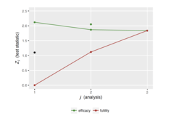 Group sequential design is the application of sequential analysis to clinical trials. At each interim analysis, investigators will use the current data to decide whether the trial should either stop or should continue to recruit more participants. The trial might stop either because the evidence that the treatment is working is strong ("stopping for benefit") or weak ("stopping for futility"). Whether a trial may stop for futility only, benefit only, or either, is stated in advance. A design has "binding stopping rules" when the trial must stop when a particular threshold of (either strong or weak) evidence is crossed at a particular interim analysis. Otherwise it has "non-binding stopping rules", in which case other information can be taken into account, for example safety data. The number of interim analyses is specified in advance, and can be anything from a single interim analysis (a "two-stage" design") to an interim analysis after every participant ("continuous monitoring").