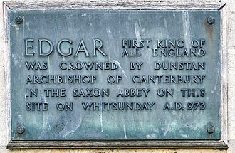 Edgar (Old English: Ēadgār Template:IPA-ang; c. 943 – 8 July 975), known as the Peaceful or the Peaceable,[1] was King of the English from 959 until his death in 975. The younger son of King Edmund I and Ælfgifu of Shaftesbury, he came to the throne as a teenager following the death of his older brother, King Eadwig.[1] As king, Edgar further consolidated the political unity achieved by his predecessors, with his reign being noted for its relative stability. His most trusted advisor was Dunstan, whom he recalled from exile and made Archbishop of Canterbury. The pinnacle of Edgar's reign was his coronation at Bath in 973, which was organised by Dunstan and forms the basis for the current coronation ceremony. After his death he was succeeded by his son Edward, although the succession was disputed.