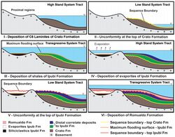 The deposition of the Ipubi Formation represents a transition from a transgressive systems tract to a maximum flooding surface. Six stages in the depositional cycle were described by Fabin et al. in 2018:[7]