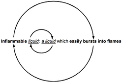 If one concept is defined by another, and the other is defined by the first, this is known as a circular definition, akin to circular reasoning: neither offers enlightenment about what one wanted to know.[7] "It is a fallacy because by using a synonym in the definiens the reader is told nothing significantly new."[5]