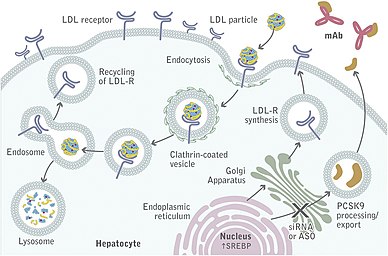 Under normal conditions, PCSK9 binds to the LDL-LDLR-complex and directs both to the lysosome for degradation.[13]
