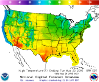 The NWS, through a variety of sub-organizations, issues different forecasts to users, including the general public. Although, throughout history, text forecasts have been the means of product dissemination, the NWS has been using more forecast products of a digital, gridded, image or other modern format.[25] Each of the 122 Weather Forecast Offices (WFOs) send their graphical forecasts to a national server to be compiled in the National Digital Forecast Database (NDFD).[26] The NDFD is a collection of common weather observations used by organizations and the public, including precipitation amount, temperature, and cloud cover among other parameters. In addition to viewing gridded weather data via the internet, users can download and use the individual grids using a "GRIB2 decoder" which can output data as shapefiles, netCDF, GrADS, float files, and comma separated variable files.[27] Specific points in the digital database can be accessed using an XML SOAP service.