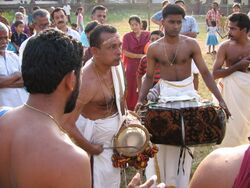 The idakka (Malayalam: ഇടയ്ക്ക), also spelt edaykka/edakka, is an hourglass-shaped drum from Kerala in south India. This handy percussion instrument is very similar to the pan-Indian damaru.[citation needed] While the damaru is played by rattling knotted cords against the resonators, the idakka is played with a stick. Like the damaru, the idakka's pitch may be bent by squeezing the lacing in the middle. The idakka is slung over the left shoulder and the right side of the instrument is gently beaten with a thin curve-ended stick.[1] It is played in temples and in performances such as Kathakali and Mohiniattam classical dance.[2]
