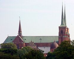 Located on the site of a 10th-century wooden church, the cathedral was built in the 12th and 13th centuries when the Romanesque style was influenced by Gothic trends from northern France.[52] It was the first Gothic cathedral in Scandinavia to be built of brick, resulting in the spread of this style throughout northern Europe. With its 39 royal tombs, the cathedral is to this day the burial site for Danish monarchs. Since 1995, it has been listed as a UNESCO World Heritage Site, encouraging some 100,000 tourists to visit it each year.[53] The cathedral houses a museum on its upper floor, tracing the building's history. A working church, it also hosts concerts throughout the year.[54]