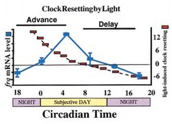 In 1995, Loros and Dunlap worked to uncover the molecular basis underlying how light resets the clock, a mechanism later shown in collaborative work with Hitoshi Okamura to be conserved in mammals.[17] The daily cycle in frq transcript levels, combined with the ability of light to acutely induce frq expression, explained light resetting (the advances and delays seen on a phase response curve). If light was provided and induced frq-mRNA when it was rising to peak levels (late subjective night), light would rapidly bring frq-mRNA levels to peak values, resulting in an advance. If light induced frq-mRNA while its levels were falling (early subjective night), frq-mRNA would rapidly go back to peak levels causing a phase delay. The results of this investigation led to the conclusion that the light induction of frq is responsible for the phase-specific advances and delays observed in Neurospora and provided a general explanation for how the unidirectional response of a clock component to an environmental signal (light) could result in a bidirectional time-of-day specific clock response (advances or delays): the basis for circadian entrainment.[2] These experiments eventually led to the universal recognition of entrainment via light-induced changes in a specific variable of the circadian oscillator, later observed in Drosophila and mammals.