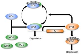 The mechanism through which frq is induced by light was unknown at the time that entrainment was explained, and studies aimed at identifying the proteins responsible for light-induction of frq led to the identification of White Collar-1 and White Collar-2 as components of the circadian activator complex.[18] Work by Giuseppe Macino had shown White Collar-1 to associate via PAS domains with White Collar-2 to create the White Collar Complex; Dunlap, Loros and colleagues showed how this heterodimeric complex is the transcription factor that acts in the dark to drive expression of frq, thereby acting as the activator in the circadian negative feedback loop. This observation associated specific biochemical activities, DNA binding and transcriptional activation, with known clock proteins, allowing the formulation of the oscillator as a single step transcription-translation negative feedback loop.[18] Later, in 1997, the first mammalian clock gene (CLOCK) was shown to encode a protein similarly having PAS domains and, later, to associate via PAS domains with a different protein, BMAL1, again forming a heterodimeric protein complex that acted as a transcriptional activator; similar proteins were identified in 1998 in Drosophila. This confirmed a common model for the transcription-translation negative feedback loops in fungi and animals: a positive element composed of two different proteins interacting via PAS domains drives expression of negative elements such as FRQ or PER that, in association with other proteins, represses the activity of heterodimeric activators: negative feedback.[19] These observations contributed to the naming of Circadian Rhythms as first runner up to Breakthrough of the Year in Science magazine in 1997.