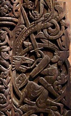 In Norse mythology, Fáfnir (/ˈfɑːvnɪʐ/ in Old Norse and /ˈfaupnɪr/ in Icelandic) or Frænir is a son of the dwarf king Hreidmar and brother of Regin, Ótr, Lyngheiðr and Lofnheiðr.[2] After being affected by the curse of Andvari's ring and gold, Fafnir became a dragon and was slain by Sigurd.