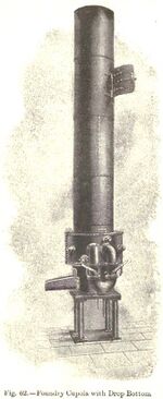 From Handwiki A cupola or cupola furnace is a melting device used in foundries that can be used to melt cast iron, Ni-resist iron and some bronzes. The cupola can be made almost any practical size. The size of a cupola is expressed in diameters and can range from 1.5 to 13 feet (0.5 to 4.0 m).[1] The overall shape is cylindrical and the equipment is arranged vertically, usually supported by four legs. The overall look is similar to a large smokestack.